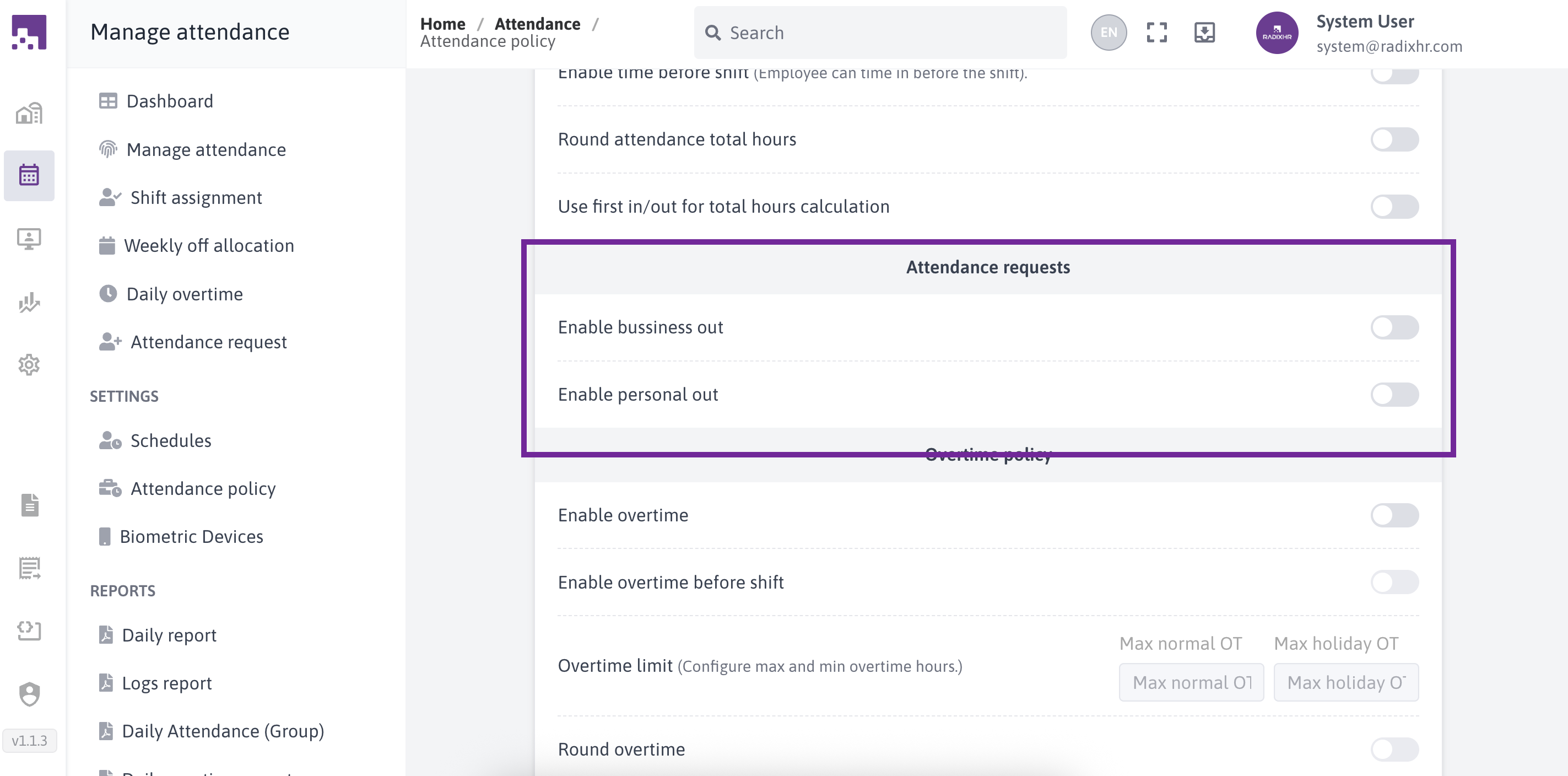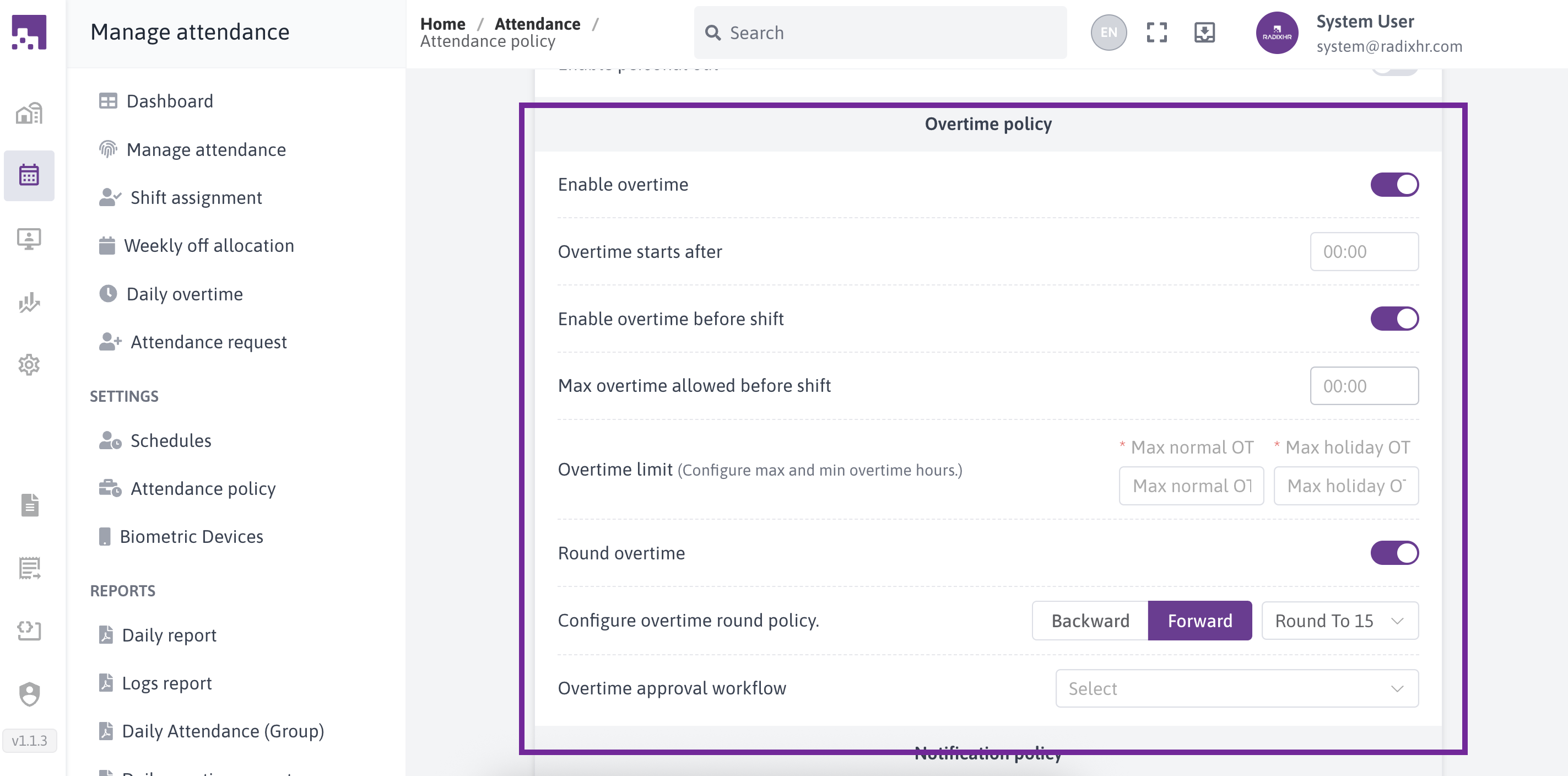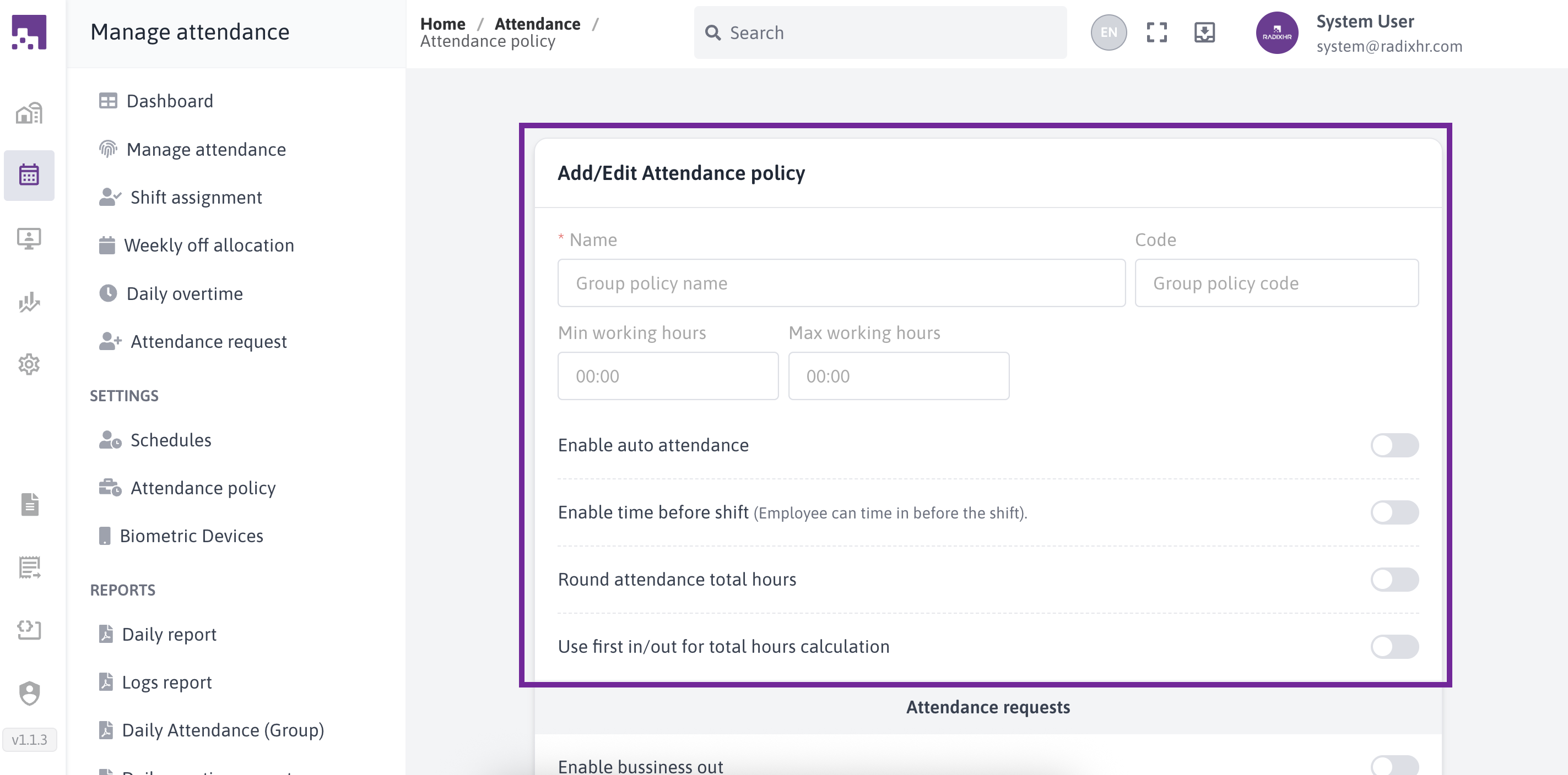 The Attendance Policies section in RadixHR allows administrators to define how employee attendance is recorded, calculated, and managed. These policies control working hours rules, attendance calculation methods, request handling, and overtime behavior.Attendance policies can be created and assigned to employee groups to ensure consistent attendance tracking across the organization.