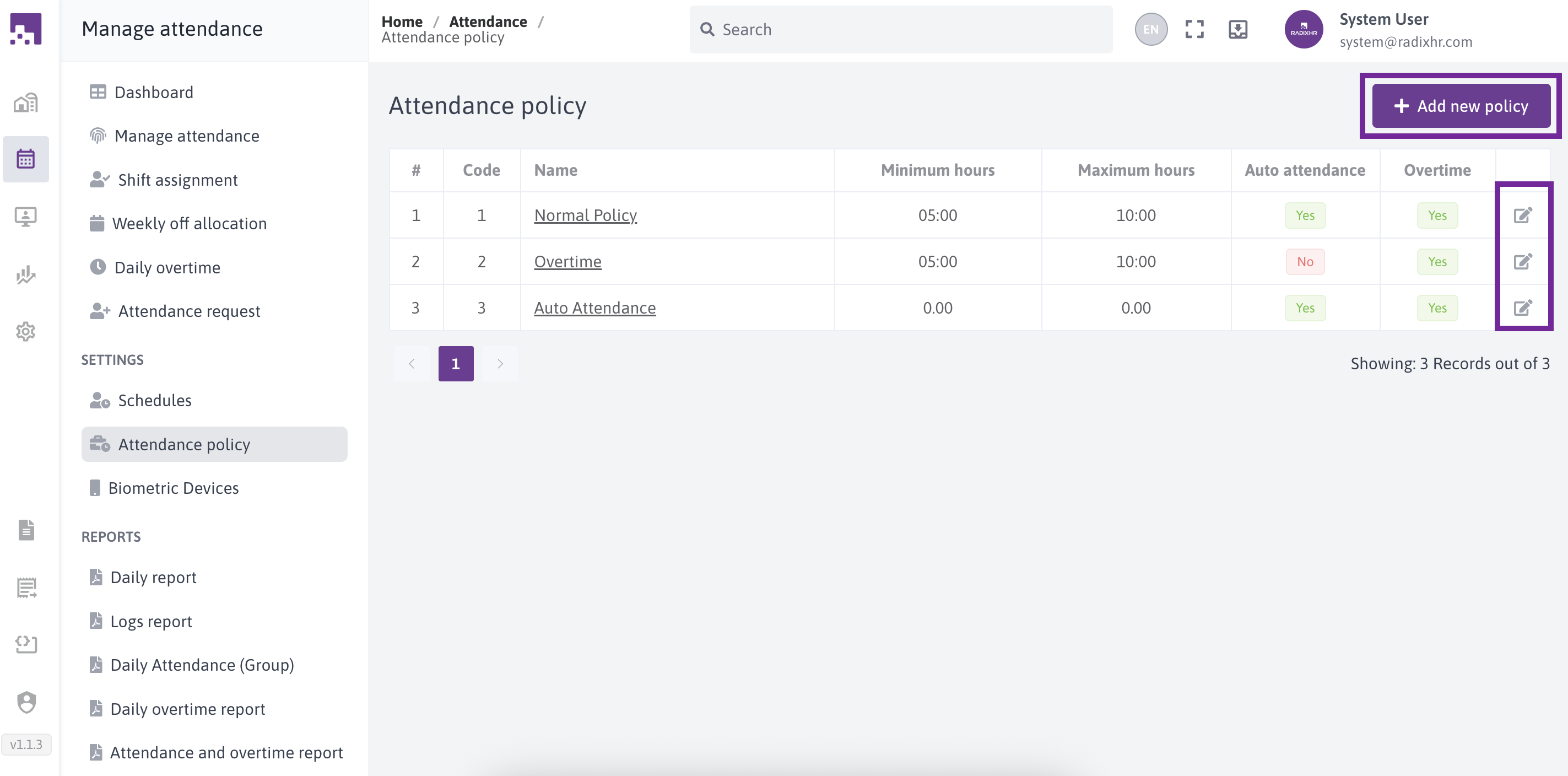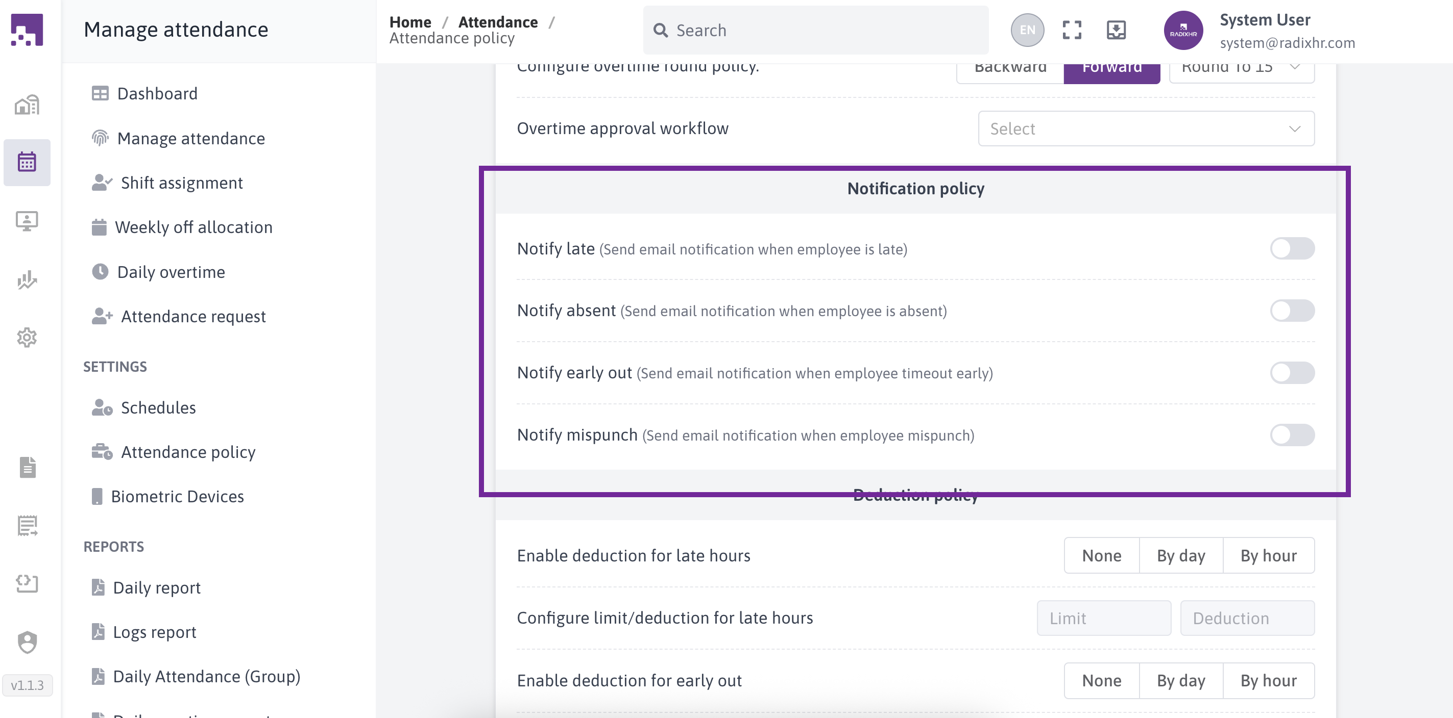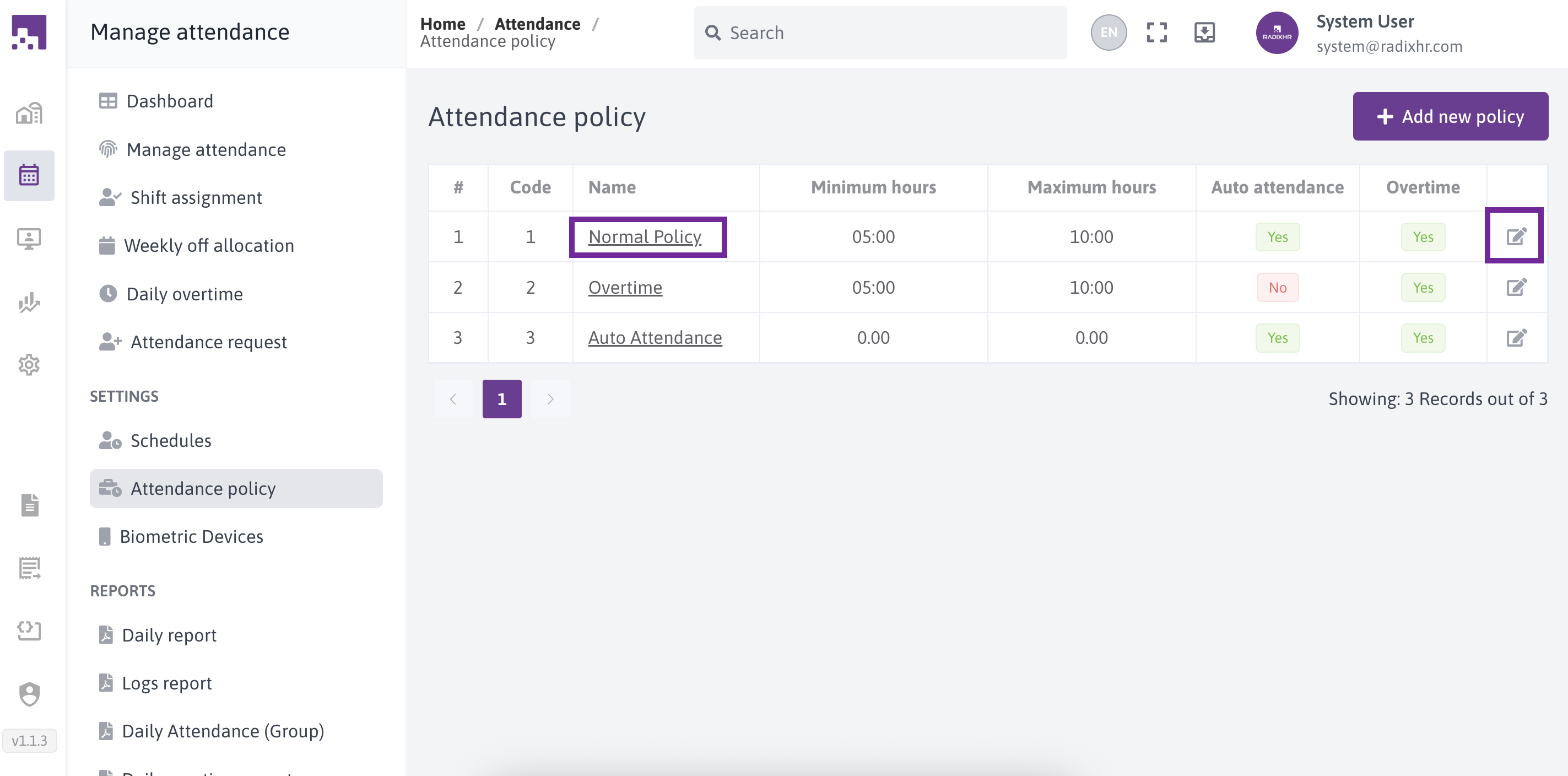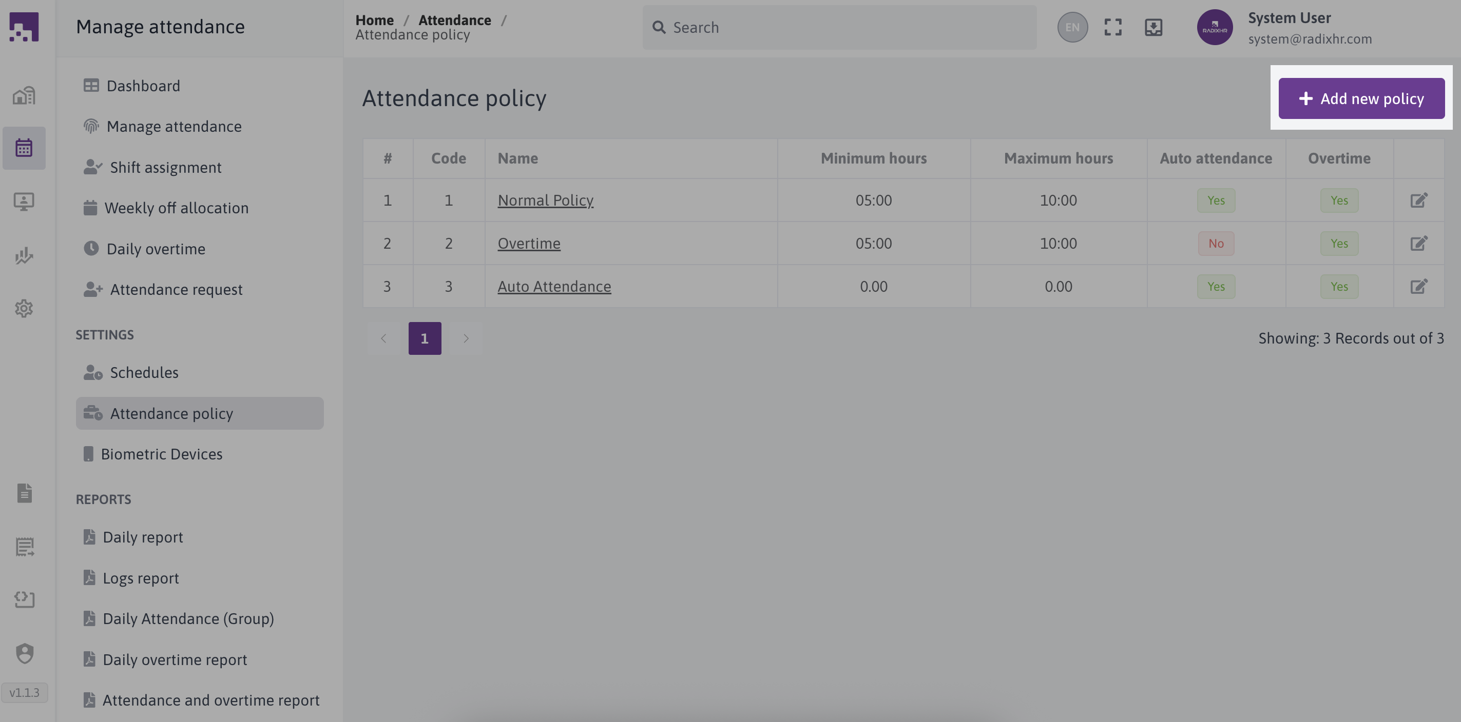 The Attendance Policies section in RadixHR allows administrators to define how employee attendance is recorded, calculated, and managed. These policies control working hours rules, attendance calculation methods, request handling, and overtime behavior.Attendance policies can be created and assigned to employee groups to ensure consistent attendance tracking across the organization.