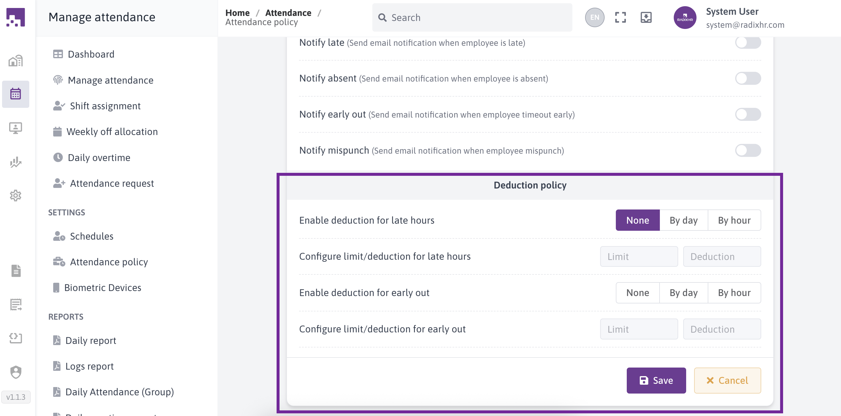 Note: Once you have configured the attendance policy according to your requirements, save the settings.This policy can be applied to employee in employee setting for the attendance management.