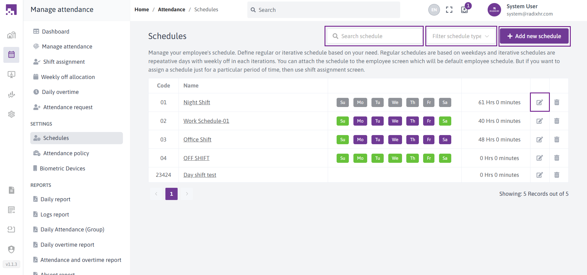 On this screen, you can view the list of attendance schedules, add a new schedule, add/Edit, Search by schedule and Filter by schedule type. The main screen displays all schedules with their working days and total working hours in a table format.