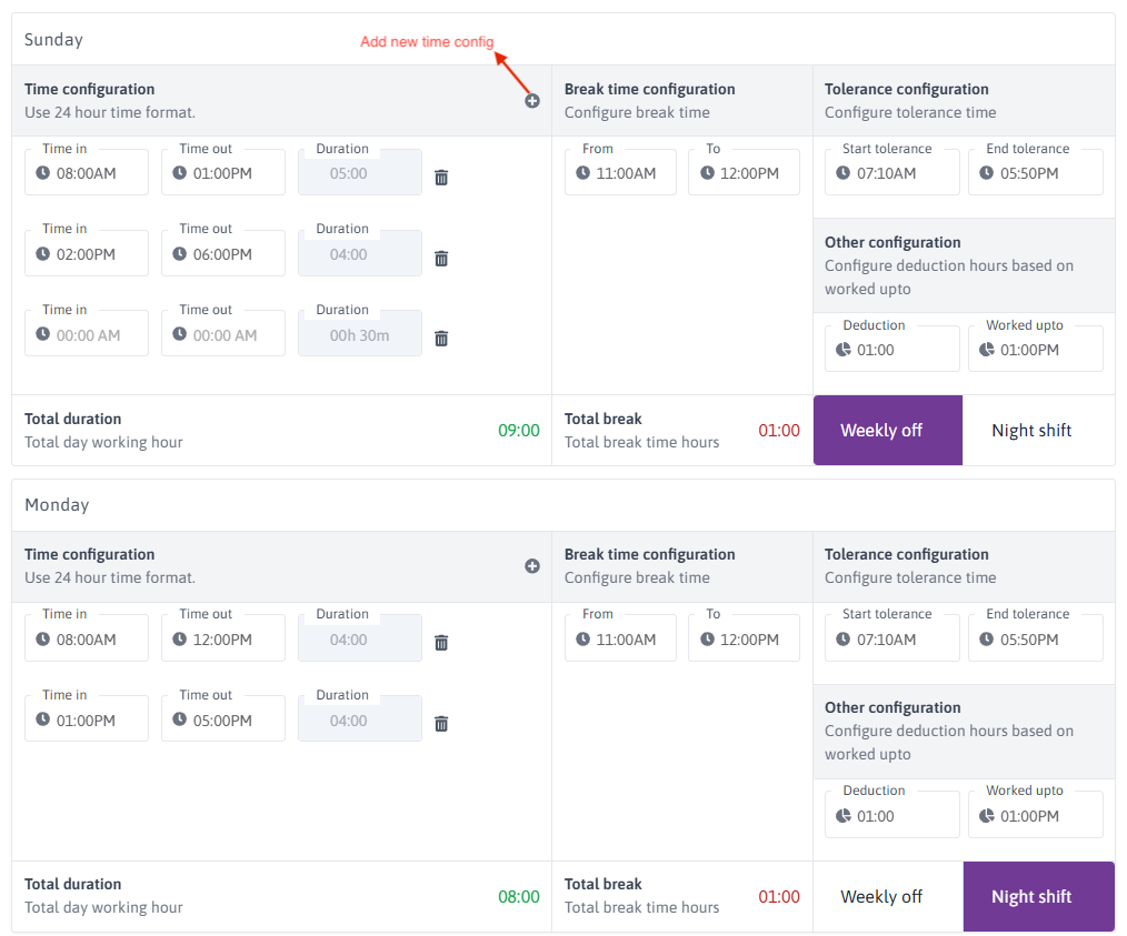 - You can configure time, break time, tolerance, and other settings for each day of the week.